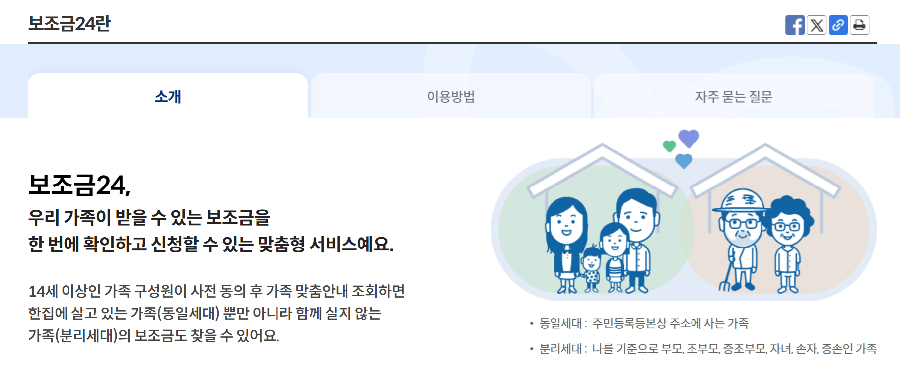 14세 이상인 가족 구성원이 사전 동의 후 가족 맞춤안내 조회하면 한 집에 살고 있는 가족(동일세대) 뿐만 아니라 함께 살지 않는 가족(분리세대)의 보조금도 찾을 수 있습니다.
